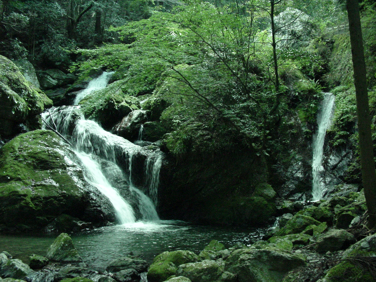 渓谷の登りがきつくなる最初に現れる特色のある形の滝。
