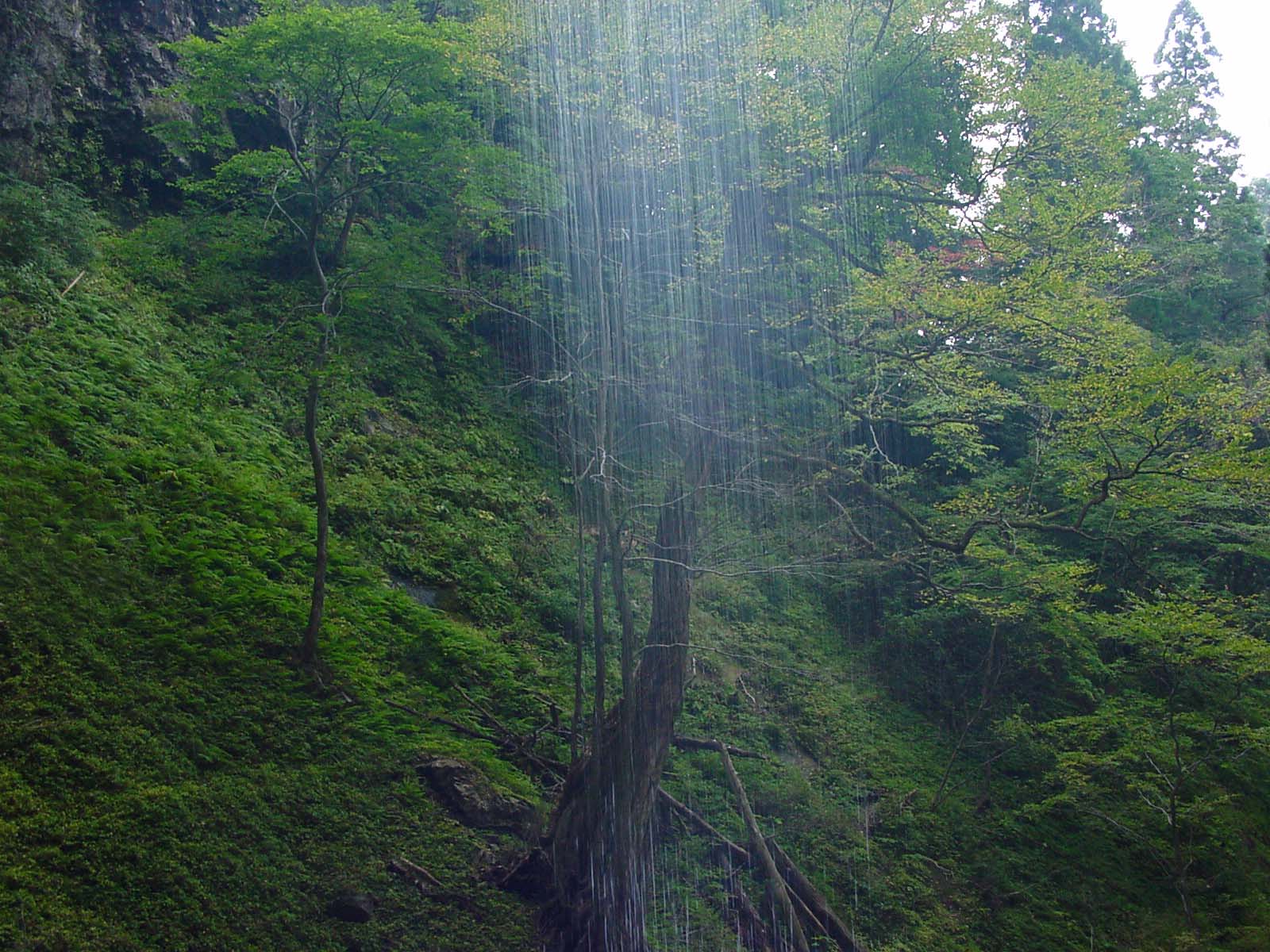 壇鏡の滝 (だんぎょのたき)2006/10/29 島根県隠岐郡隠岐の島町都万(つまん)那久(なぐ) 落差:約45m(雄滝) 滝の向き=西 滝の下に近づくほどレンズの水滴対策が難しくほんの一瞬で撮らなければならない。 この日は水量が少なく恨みではなく裏見には適していたかもしれない。 滝水の叩きつける青く苔むした岩の周辺の草はほとんど剥げ落ちていないのをみると相当の水量が常時あるのではないことを物語っている。 壇鏡の滝の傍の横尾山が577mであることからすると継続して水量を保つことはないことが想像できる。 雨の降った翌日の晴天あたりが狙い目ではないだろうか。 西向きの谷であるので午後のほうが撮影コンディションはいいだろう。 私は11〜13時にいたがもう少し時間帯が遅かったほうが良かったようだ。 但し裏見は午後には逆光になることは考慮に入れておくべきだ。 滝が懸かっている垂直大岩壁はオーバーハングしているのではないかと思えるほどに下からは見え、滝前の谷は広く開け、わずかに紅葉が始まった広葉樹やうっそうとした針葉樹の大木が茂り神霊な空気を漂わせていた。 |