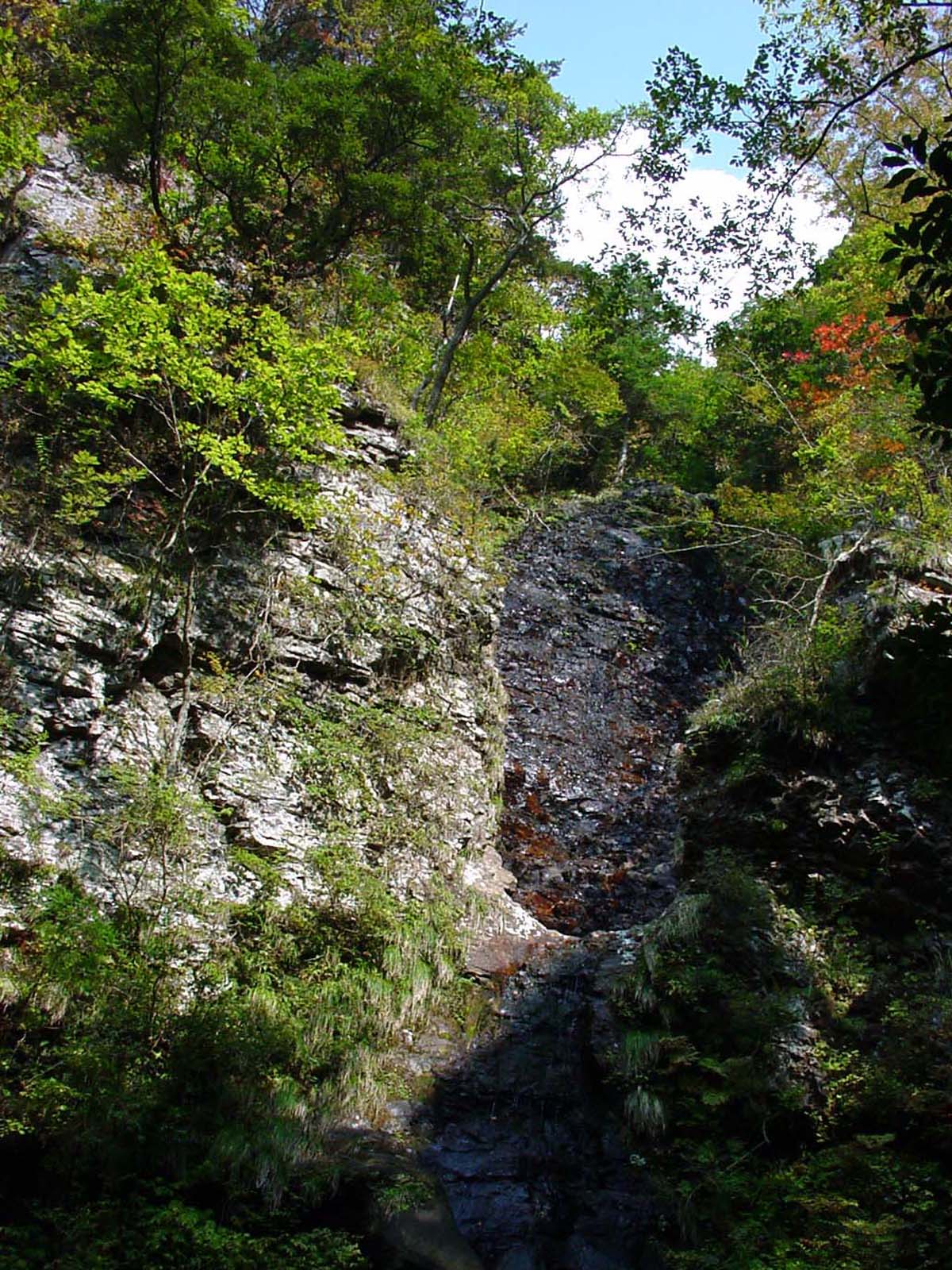 壇鏡の滝 (だんぎょのたき)2006/10/29 島根県隠岐郡隠岐の島町都万(つまん)那久(なぐ) 落差:約35m(雌滝) 滝の向き=西 水のないのは雌滝も同様でした。 かなりショッキングな滝床です。 滝上部の流出部と滝下部では岩の質が異なるようで徐々に滝下に向け剥げ落ちが広がってきているようです。雌滝なだけに赤い岩が何かを産み落とすようなイメージの滝床です。 この画面の外の下のいわゆる滝下部は溶岩のマグマが垂れ下がった風船のように固まっていて更にグロテスクな岩の形です。 しかしこのような滝の内臓部とは反対に一旦水が流れると全くイメージが異なる化粧をした様相をなすのですから滝は化け物ですね。 |