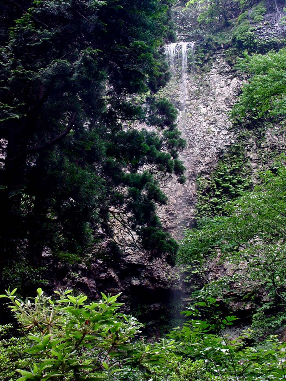 壇鏡の滝 (だんぎょのたき)2007/07/09 島根県隠岐郡隠岐の島町都万(つまん)那久(なぐ) 落差:約45m(雄滝) 滝の向き=西 昨年10月に訪ねた折には水量が極度に少なかった。 いずれ再訪したいと思っていた折に願ってもないチャンスが巡ってきた。 話の始まりは先月の初め関東東北の百選滝訪瀑の旅で写録の旅人さんにサポートしてもらったうえMTBフェラーリを98滝達成記念にプレゼントしてくれる約束ができていた。 私がそれまで愛用していた12インチ車輪のヘンツは代わりに養子に出すことになっていてそのフェラーリを届けに京都を通過するというのだ。 写録の旅人さん旅の主目的は壇鏡の滝訪瀑であったのでこれに便乗しない手はない。 「壇鏡の滝ご一緒しましょうか?」 「いや一人で行きます」 ところが6時間前にMTBフェラーリの受け取り場所のTELをすると 「kaidosun一緒に行きませんか?」 「あれ?どうして??」 「Banksでいきますから・・・」 理由はどうでもいい、こうして写録の旅人さんに壇鏡の滝行きを誘ってもらえたのだ。 そして、まあまあの水量の壇鏡の滝にあえた。 更に自主トレに励もう。 |