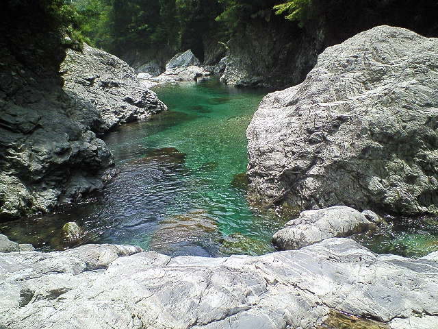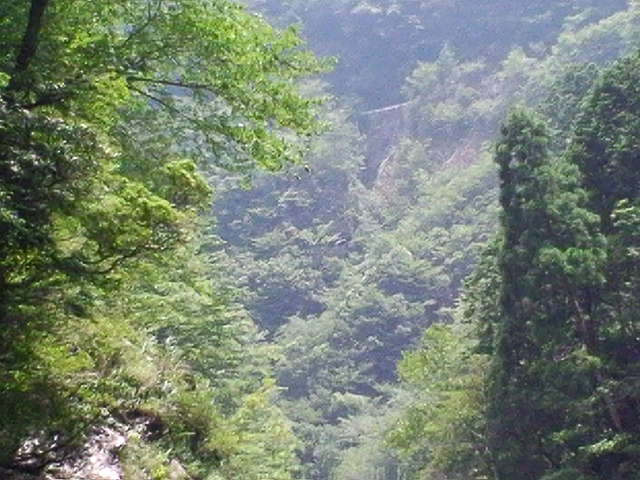 階段登り口 2004年台風でごらんのような状態 ここでカメラ、三脚、水以外は川原岩場に残し階段登り開始15分位で展望台。 先客を含め10名くらいがそれぞれ撮影、談話、休息。 |