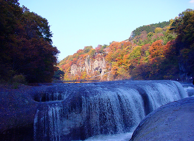 吹割の滝 2003/11/01 群馬県利根郡利根村 高さ:7m、巾:30m余。 観漠台(対岸の山上)から見ると滝の様子が一望できるようだ。 滝というより急流堰のイメージだ。 川上に見える橋の上からも見えるが迫力に乏しい。 手前の溝(滝壷)は川幅方向に半分程度陥没していて滝の水は左手前から下流に流れ出していく。 右手の滝壷上の川床を流れてきた水は手前の岩に緩く回り込み手前の溝(滝壷)壁に流れ落ちていく。 そのため水量の多い時は、危険なため手前の岩の上からの観漠は禁止される。 左側の穴は甌穴(おうけつ、ポットホール、亀穴、大釜)といい長い年月に岩の柔らかい部分が水や砂、小石の渦でできた侵食穴だ。木曽川の寝覚メ床、荒川の長瀞、龍双ケ滝下流でも見ることが出来る。 宮崎県の関之尾の滝の上流の関之尾甌穴群が世界一の規模だ。 |