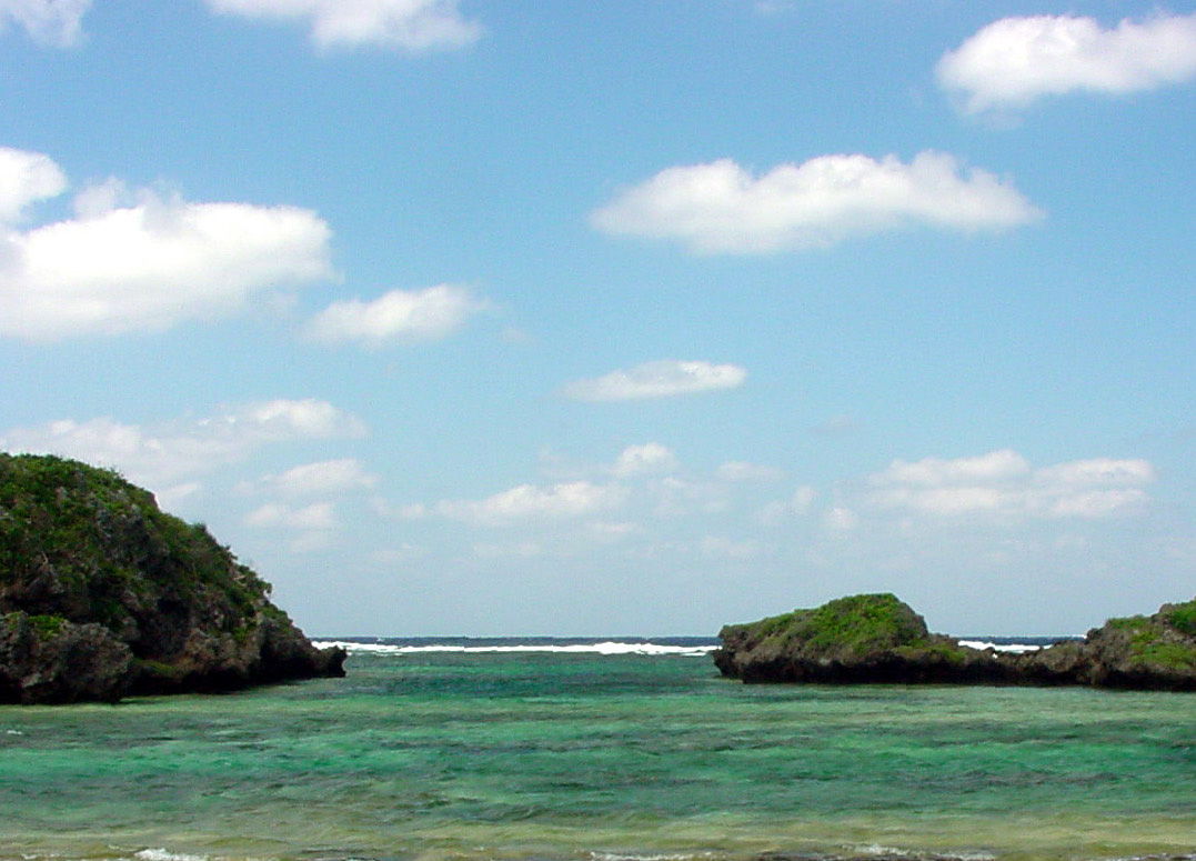 小さな岩が海上に散らばり海の透明度が高く青空が高く見える。 おきのさんご礁との境界に白波がたって美しい。