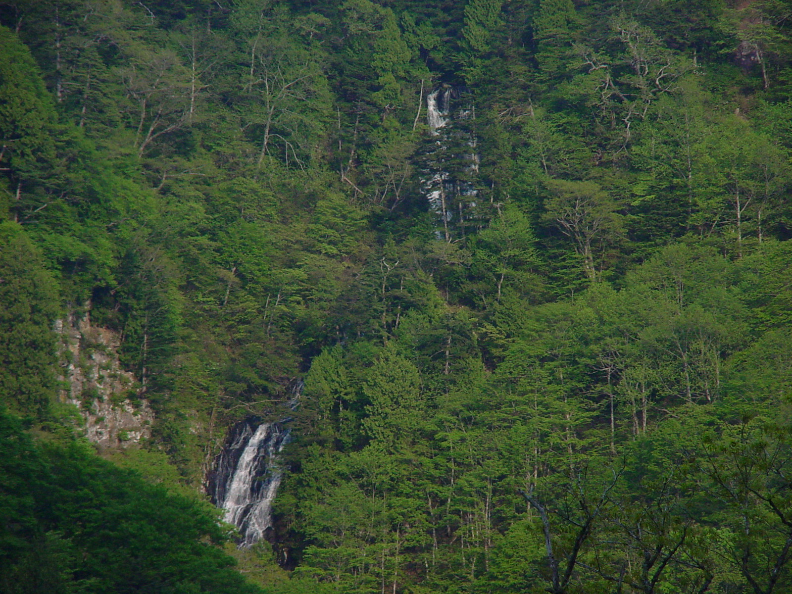 左が「赤滝」、右が「黒滝」で山に融けこんだ姿が印象的。