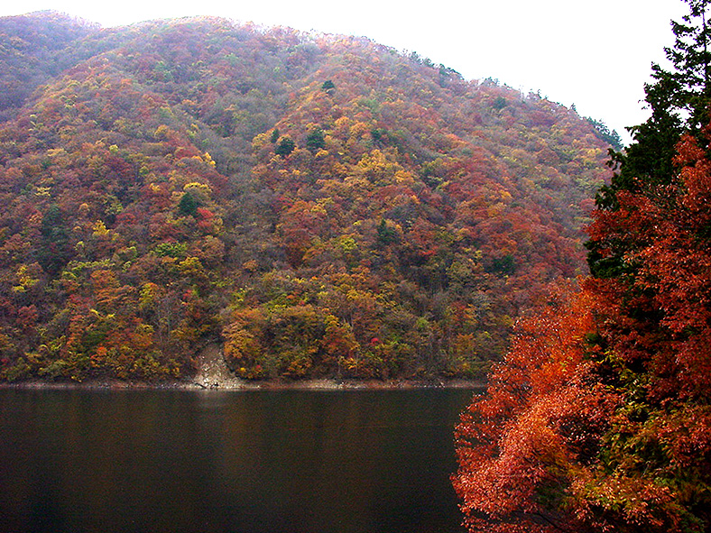 広瀬ダムの紅葉 2003/11/03 山梨県山梨市三富 十時すぎに丸神の滝を切り上げてひたすら帰路につく。 国道140雁坂トンネルを過ぎ山梨県に入る。 広瀬ダムあたりで急に紅葉が鮮やかになり雷が鳴る妙な空模様。 この近くの笛吹き川の上流の西沢渓谷に「七つ釜五段の滝」が落ちる。 甲府を過ぎるとやはり雨がきた。 中央自動車道>長野自動車道>上越自動車道>北陸自動車道> 加賀橋立ての割烹旅館ゆもとまで500kmを一気に駆け抜けた佐々木氏には敬服するばかり。 一ヶ月ぶりに懐かしの(みっちゃん)が、笑顔で迎えてくれた。 以前、丹後でバスガイドをやっていたという彼女には言葉の壁が無い。 「さあさあ飲みにゃー」 「うわーがっしゃうみゃーなーこの酒」 「まーそんぎゃに急いで飲まんでも、私も今夜はゆっくり酔わしてくんにゃーな」 |