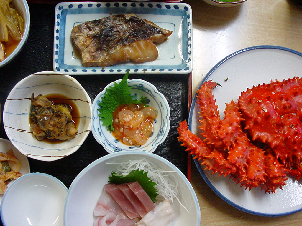 宿の食事 2005/06/23 根室市花咲港65番地 何とも幸せな名の「花咲旅館」。 根室市花咲港65番地 TEL:0153-25-3718 \5000円〜6000円 特別に考えた名称でないことは花咲港にある旅館ということで解るのだが・・・。 花咲ガニもタラバガニと同じで”かに”ではなく”やどかり”の仲間なのだそうだ。 なるほど、だから足が6本しかない。(チョキの親指は足でなく手) 根室の花咲半島でとれるからこの名前になった希少品でタラバより高価。 この日の夕食は蟹をいれて13品、一泊2食付き税込み\6,000-。安い?高い? とにかく北海道は何処に行っても食材が豊富で旨い。それが原因なのかどうかほっそり女性には中々お目にかからない。 根室特産品:花咲ガニ,コンブ,コンブしょうゆ,カニの鉄砲汁缶詰,サケフレーク 根室かに祭り(9月上旬)という。 |