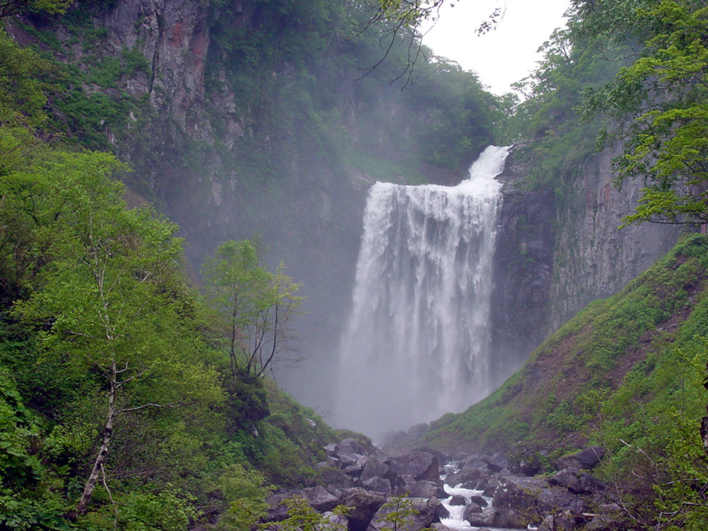 飛竜賀老の滝 2005/06/20 北海道島牧郡島牧村 落差:70m、幅:35m 水の無い滝壺に松前藩が財宝を埋め竜神が守るという。 我々二人が遊歩道を歩いて行くと若者が無気力に帰ってきた。 「も〜、疲れま〜へた〜・・」と呟いて過ぎていった。 賀老の滝→の標識で急階段の土道を谷に降りていくと足に体重がガツンガツンかかる。 急階段10分ほどで滝前に辿り着くが、しぶきが瀑風にのって襲ってくる。 レンズをタオルで覆い構図をイメージしてから素早くピントをあわせてシャッターを切る。 有無をいわせず男性的に迫ってくる滝だ。 帰りは心臓破りの急階段を帰ることになる。 汗がそれこそ滝のようにでて口が粘つく。 10歩登って5歩休息を繰り返しながら標識に辿りつくと目まいと脱水状態。 「も〜、疲れま〜へた・・」を実感。必ず水を携行するべきだ。 夢遊状態で歩いていると熊笹のはえた林から間抜けなサイレンの音。 「昼のサイレンかな?」などと思っていると所々で笹が揺れている。 熊避けをしながらの山菜採りとわかった。 駐車場の広場でどっかりと腰をおろしてチシマザサ(親指大の竹の子)を手際よくナイフで整えながら「人殺しはいないし空気が旨い・・夜空はきれいだよん」と真っ黒に日焼けした髭面のおやじが吠えた。エ〜ゾ!北海道!店では10本/500円くらいらしい。 |