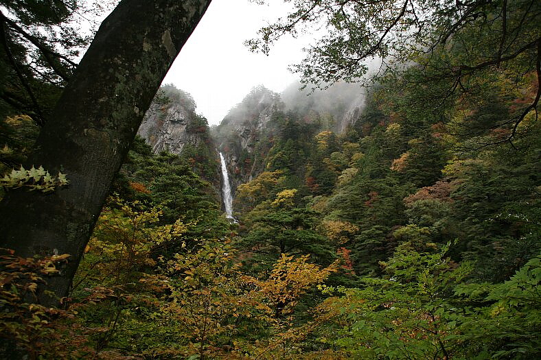 御来光の滝 2007/10/27 愛媛県上浮穴郡久万高原町若山 落差:102m 滝の向き=南 2007/4/29の初訪瀑時、秋の紅葉はさぞすばらしいだろうな〜と想像していました。 そして、今回のおいわさん主催の「御来光の滝紅葉ツアー」に男女9名の一員として参加できた。 その往路の南沢からの最後の高巻き登山路頂上付近で御来光の滝全景が見える新しいビューポイントを偶然に発見するというサプライズに遭遇した。 ![]() 全員興奮しお互いの幸運をたたえあいました。 こんなに完璧な御来光の滝全景がみえる場所は今までなかった。 自然はいつも私達に何か新しいサプライズを与えてくれるのですね〜。 |