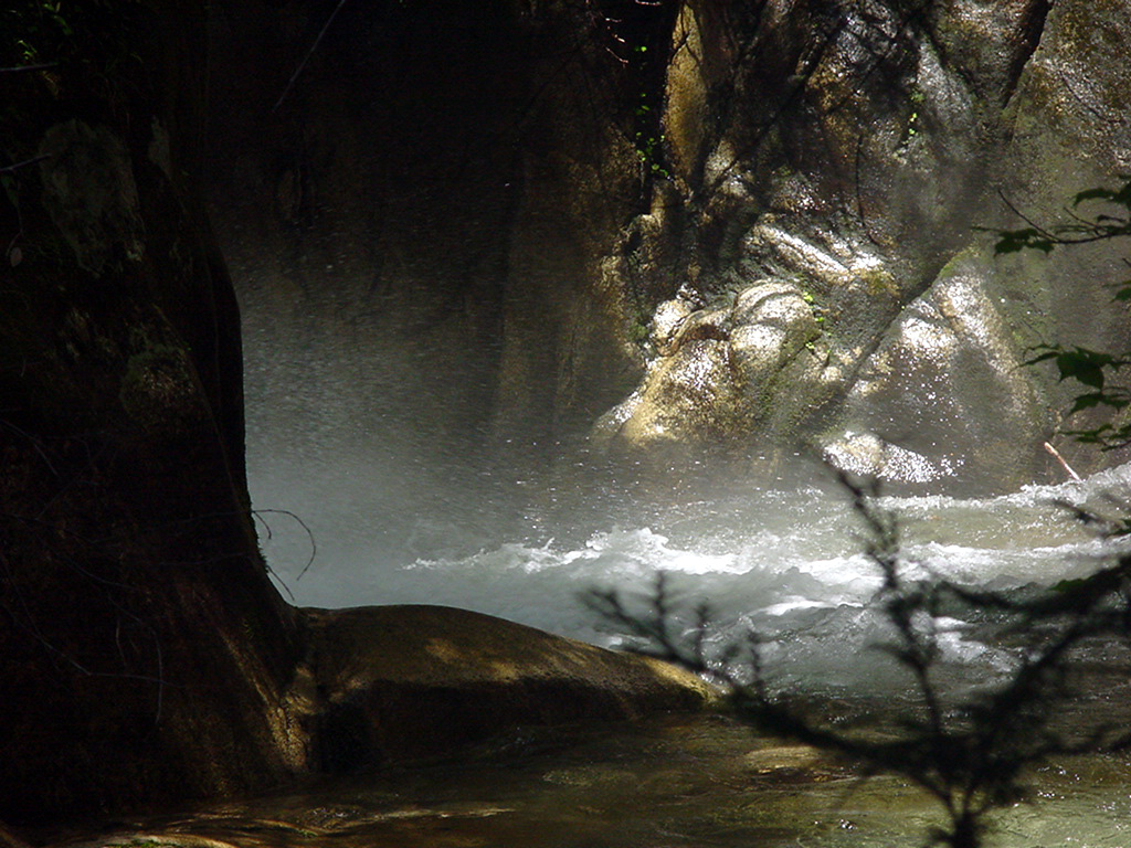五つの滝が落差200mを連続曲折して奇岩怪石間を流れ落ちるさまは、神秘的だ。 どの角度から撮ってもカレンダー写真になるほどの造形美だ。 「名水百選」に選ばれた麗水でもある。
