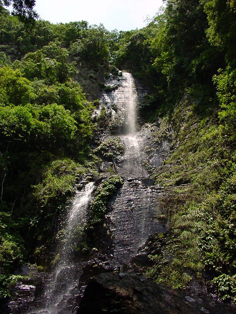 八草の滝 2006/05/30 和歌山県白浜町日置(ひき) 品瀬川谷 落差:22m その程度の評価の滝なのか? 地図を詳細に見ると、日置川の川下の久木橋詰めからせいぜい1Kmの距離だ。 この岩山の裏が白浜町北部で山路が何本か通じているようだ。 400m程度の鉢伏せ状の山に挟まれた源流から継続した水量はなく、大雨後の数日間だけと推測される。 天候を見計らって対岸の『八草の滝』看板から眺めてみた。 滝下からこんもりとした森が久木橋に至っている。 この森の下は、どんな状態なのだろうか? 人が入っていないはずがないと思われた。 熊や猿に出会わないことを祈り単独行を決めた。 |