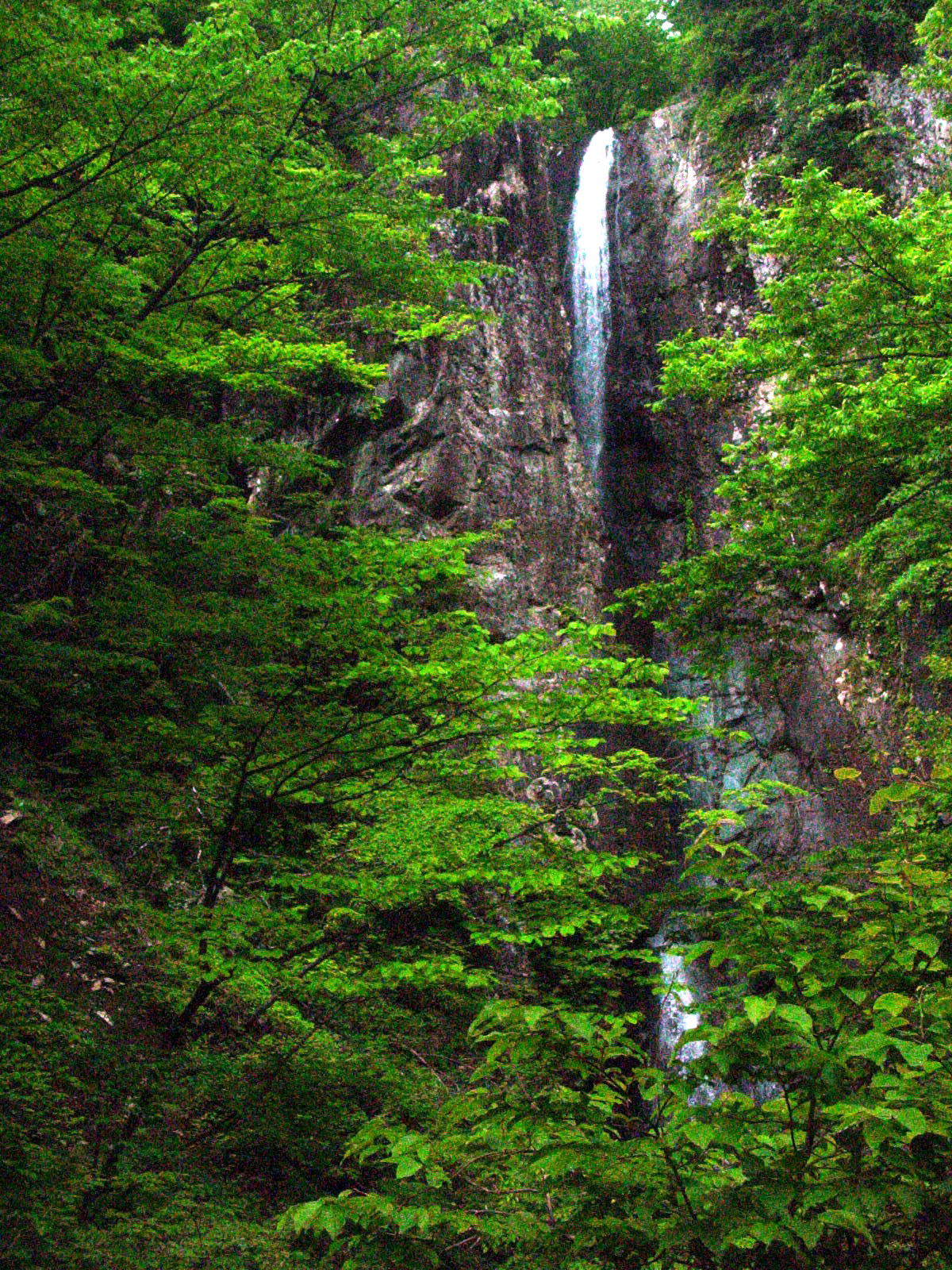早戸大滝 2007/06/02 神奈川県相模原市津久井町鳥屋 落差:50m(上段40m+下段10m) 滝の向き=北西 塩川滝を終えたイチローさんと私は早戸大滝の出発点、伝道近くまで車を走らせた。 7:00スタート歩10分で早戸大滝看板の真裏にある踏み跡のあるきつい傾斜路を20分準備体操がわりに登ると造林小屋が見えたいらな山道で楽になりペースアップ。 さらに傾斜した山肌を横切って進むと7:40川原にたどり着いた。 丸太の橋は流されているので、スパッツを着け潔くジャブジャブ渡り。 その後もう一つの木橋は難なく渡れ大滝の手前分伎の雷平で小休止。 渓流釣りのおやじが気楽に一人で釣りをしている。 大滝沢と雷滝がある原小屋沢が合流しているここから左側の大滝沢の上流に向かう。 その後何度か渡渉しながら最後は滝前を遮るような高台に行き当たるが高台の背後の急斜面を、9時前にロープや木の根を使ってよじ登ると大滝が正面に見えた。 この高台から眺めると上段の中程に大きな岩が被っていて全体が見えない。 別名「まぼろしの大滝」の所以だ。 このポイントの写真だけで満足するのが普通の人だ。 |