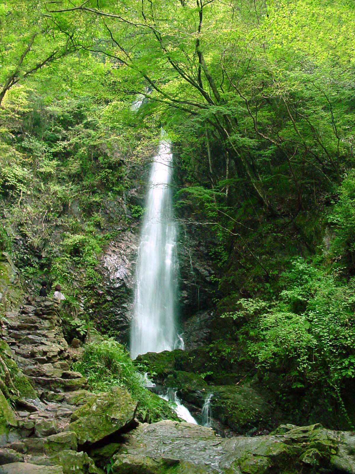 滝壺の近くから見上げるのが主漠一の滝(26m)で、その上に二の滝がわずかに見えている。