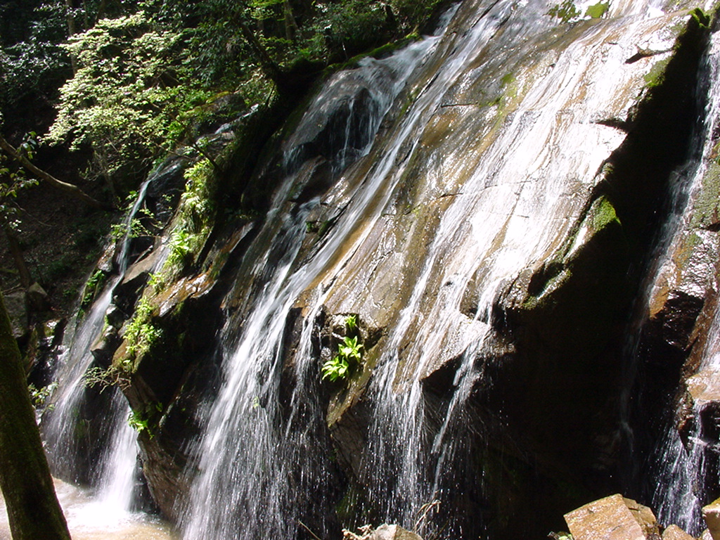 金引の滝 06/05/01 京都府宮津市滝馬 落差:40m,幅20m 福知山から北近畿タンゴ鉄道で宮津をめざす。 電車内で地元のおばさんに「金引の滝」を訊ねると「知らんわ〜あんた知っとんなるか〜?」と周りにも訊いてくれるが「知ら〜ん・・琴引きとちがうん?」という。 琴引き滝もあるか尋ねると「知らんけど・・」と無責任極まりない。 旅慣れた佐々木氏によれば「地理を女に聞くな!」と一喝される事だろう。 とっくに調べていながら訊くのだからこちらも意地悪だが、事ほど左様に《天の橋立て》の地元では「金引の滝」はマイナーな存在なのだ? |