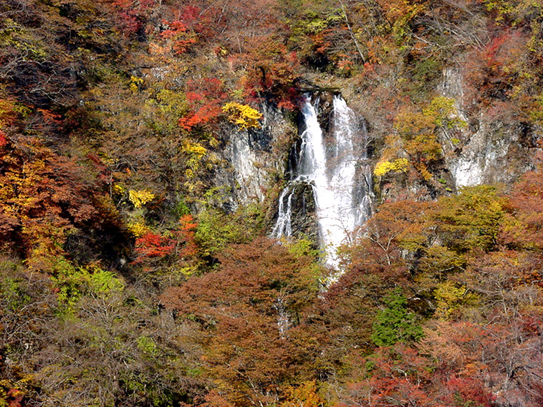上下2段に分かれ上滝25m、下滝16m、全長75m、幅15m。