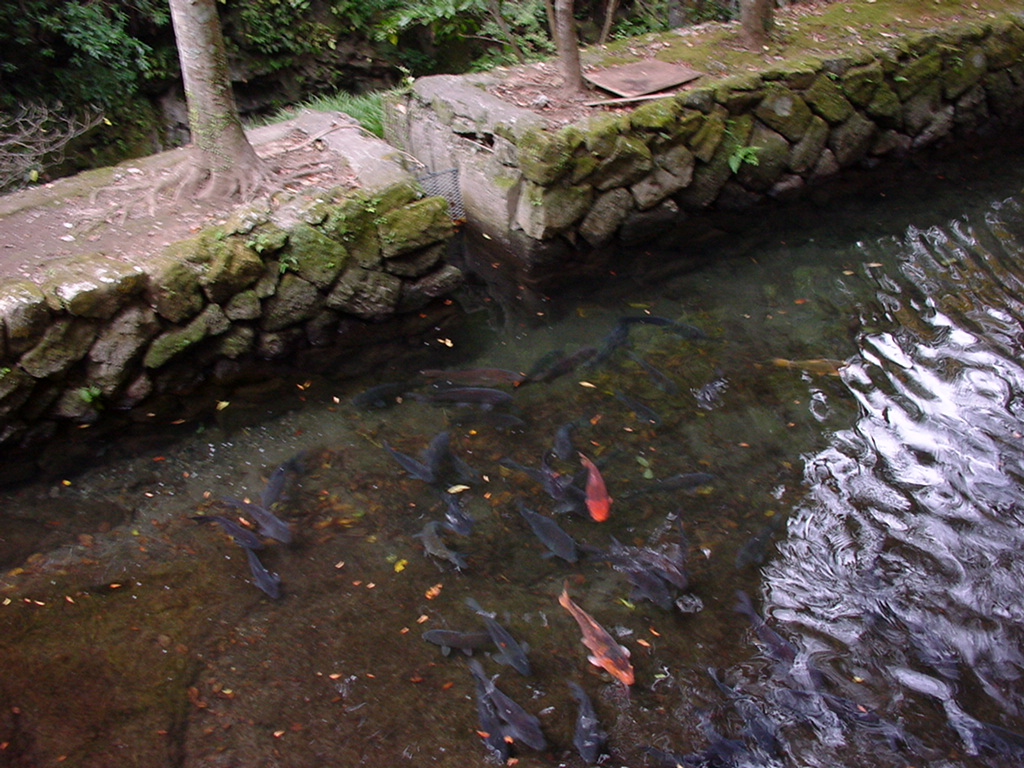 この鯉の飼われている溜池の水が中央の溝の堰板をオーバーフロウして数メートル先の滝の上から落とされているのだ。