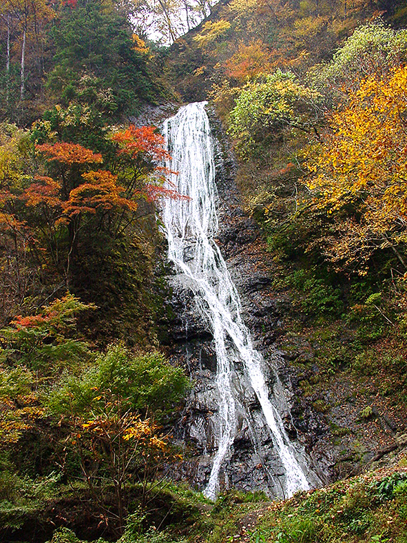 丸神の滝(まるがみのたき)1 2003/11/03 埼玉県秩父郡両神村 小森川支流 滝の高さ76m、1段目12m,2段目14m,3段目50m。 昨夜の宿民宿両神山荘の道を尋ねた際、村人がBentsS600をみて「この車で行くの?」と目をむいた。 宿に辿り着き納得できた。奥秩父の最奥の登山宿だったのだ。 前日の土曜は50人の客で宿のおかみは寝ていないという。 飛び入り客の我々二人は大座敷(食事場所)でごろ寝を覚悟した。 山荘の朝は4:30ではじまる。眠さをこらえて『丸神の滝』に辿り着く。 写真は3段目の50m部分でこの上に1段目12m,2段目14mがあるようだ。滝音以外何もきこえないこの美しい滝を我々二人は存分に楽しんだもののこの名滝は、世の中から忘れられた印象すらうける。 交通のアクセスは最悪だ。だからこそ俗化されない滝本来の姿や環境が保たれているともいえる。 エレベーター、コンクリート観漠台、鎖で囲った至れり尽くせりの見世物滝こそ不自然な滝なのだ。 |