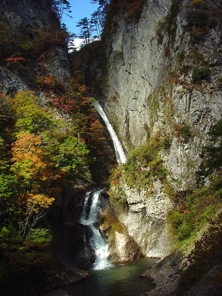 松見の滝 2005/10/20 青森県十和田市大字奥瀬 落差:90m 滝の流れ出す谷の頂上付近に姫小松が見えることから「松見の滝」と称するようになったと言われている。 大正の文人大町桂月がこの滝を世に知らしめたといわれているが、この人は北海道の百滝の「羽衣の滝」の銘名者でもある。 この日地元のTV局のクリューが取材に訪れていて紅葉と晴天に恵まれ絶好の「紅葉特集」が撮れたことだろう。 滝前で顔を紅潮させたおばさん(おばあさん?)達がクリューのインタビューに「まあこんな美しい滝を見たのは初めてです。もー死んでもええくらい」と内心察していた(この世の見納め)が本心だったのかと思ったものの女性特有の場当たり的アドリブだと察した。 TVカメラや機材の重量を思うと、カメラスタッフの疲労は半端でない重労働のようだった。 |