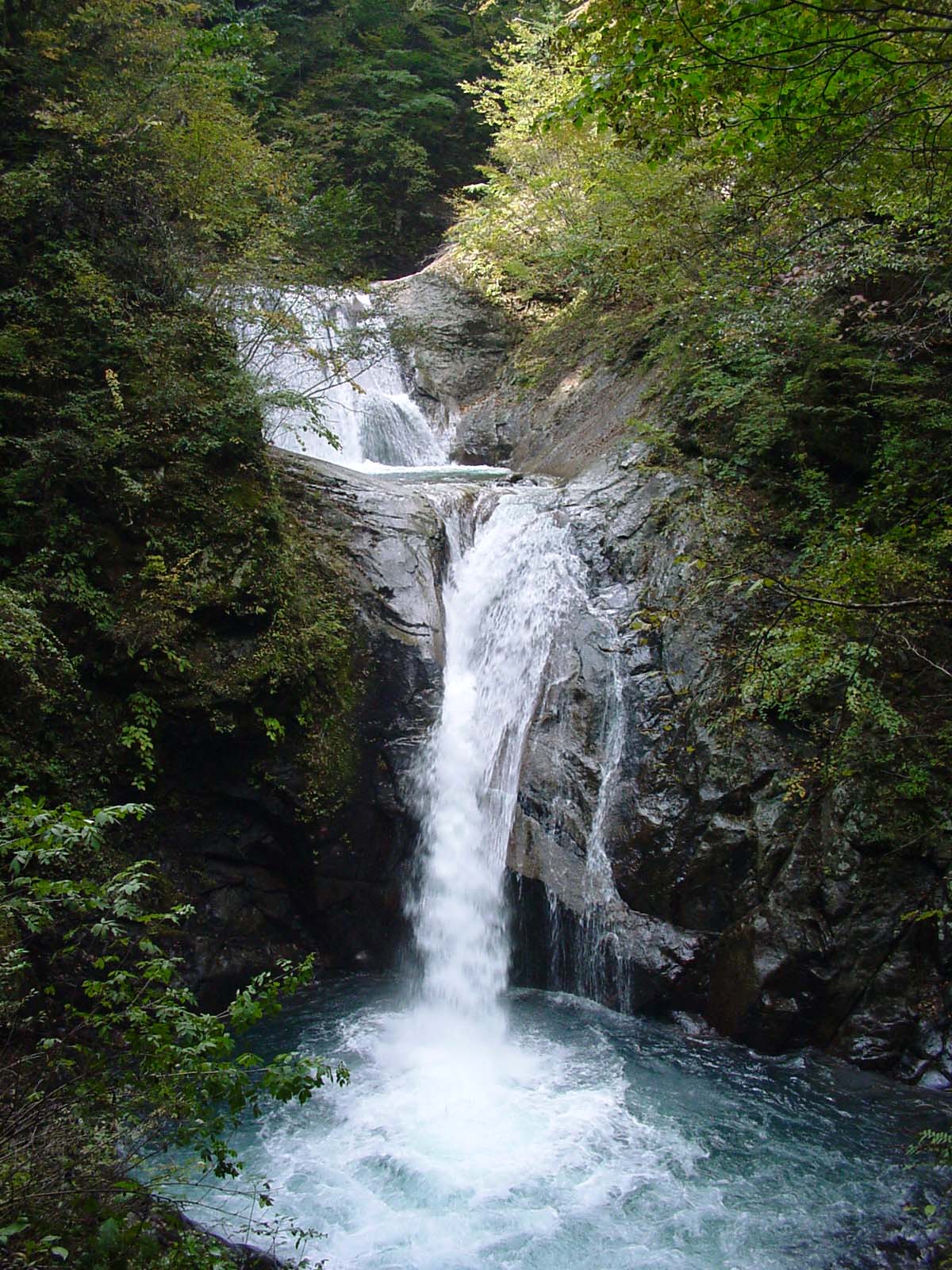 七つ釜五段の滝・下段・1 2006/10/13 山梨県山梨市三富上釜口 落差:35m、最下段の落差:20m 標高1400m 滝の向き=東南 蛙の形のカエル岩をすぎた方杖橋で対岸に渡る際、七つ釜五段の滝最下段の勢いよい飛沫横姿がみえ、急階段を登り下り始めるといよいよ「七ツ釜五段の滝」の3段目、4段目と5段目の下段部分を見る滝見の橋に着く。 (駐車場から110分前後、5段全てを一望するビューポイントはない)手前の岸からの枯れ枝がカメラ視界にはいってしまい絵になりにくい。 意を決して橋の下のガレの斜面に降りて三脚を据えると六つ目の釜が水平に見えてしまうが致し方ない。 |