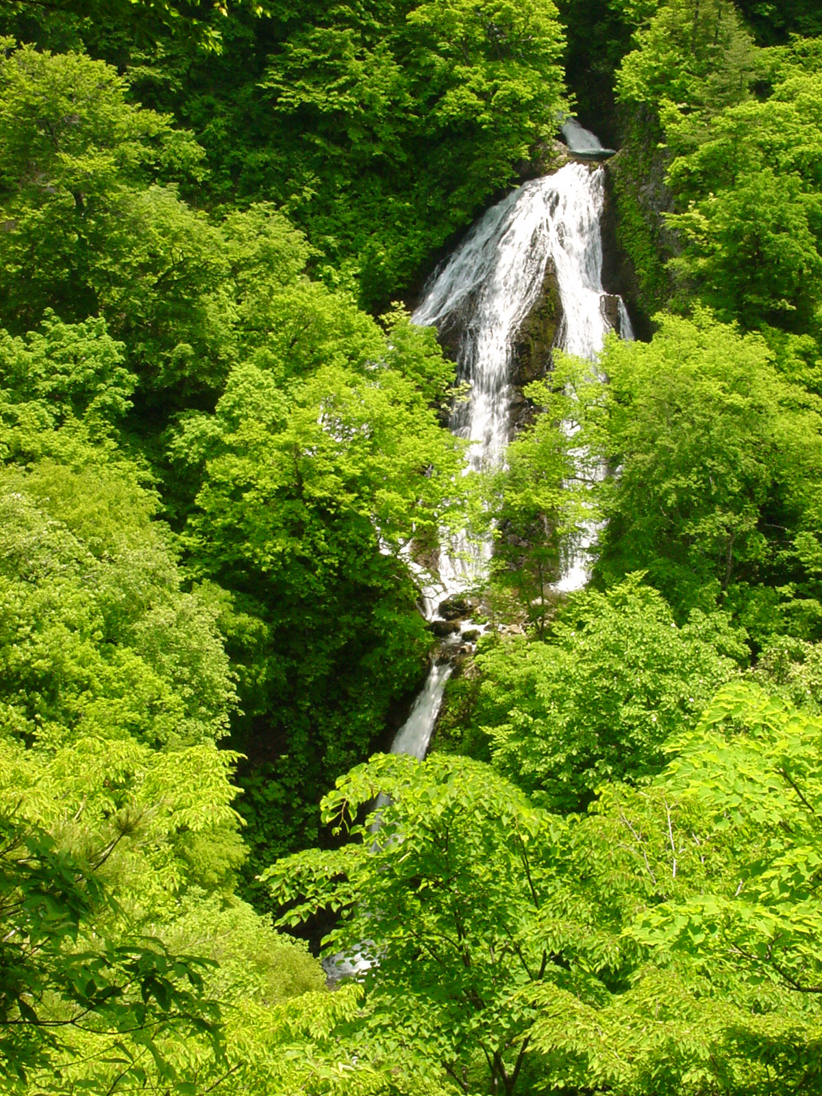 七ツ滝 2007/06/03 山形県鶴岡市(旧朝日村)田麦俣 落差:90m 幅:30m、3段 滝の向き=北 鈴ケ滝出発前に地図を調べていた写録の旅人さんがあきらめたように国道7号線に進路をとった。 後で調べたら鈴ケ滝の反対側の谷に朝日スーパー林道が通っていて山形県鶴岡市の東の落合に抜けそこから七ツ滝までは東に5Kmほどだ。 しかし鈴ケ滝から朝日スーパー林道に入るには南に4〜50Km廻りこんでこなければならない。 7号線で鶴岡に入っても距離的にさほど差がない。 しかし、よくそこまで記憶があったものだな〜写録の旅人さん。 さすがに旅の名人だ。 12時七つ滝に着く。 撮る場所は一箇所しかない。それも60cmくらいの踏み台の上から覗き込むように対岸をみるのだ。 新緑がきれいだ。 20分ほど撮って、今夜の宿営地喜多方までの道中で写録の旅人さんの豊富な訪瀑アルバムから「面白い滝」をピックアップしてもらうことになった。 名称だけ挙げておきこれらは「another100s」ぼたんのコーナーにアーカイブしています。 ・・・・・・・・・06/03:潜り滝、白布大滝、芳沢不動滝、赤滝・黒滝。 ・・・・・・・・・06/04:達沢不動滝。 |