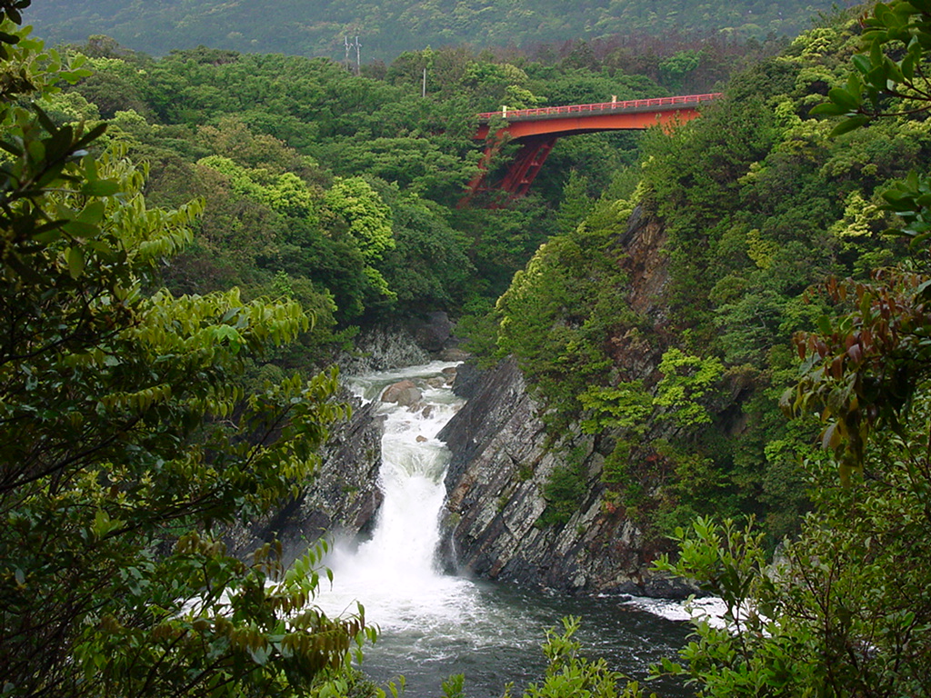 トローキの滝 2005/04/07 鹿児島県屋久町 落差 6m 安房から車で約15分、歩約10分 「ぽん・たん館」という屋久島特産品を販売する建物の道路はさんだ海側から見える。 観漠ポイントの茂みがそこだけ半丸窓のように葉が無くなっていて思わずニヤリ。 この上流が千尋の滝である。 水量の多いとき水の音が天にとどろくことから、地元では(轟き)=トローキの滝と呼ばれるのだそうだ。 屋久島には多くの滝があるが海に直接落ちるのはこのトローキの滝くらいだそうです。 北海道の知床には「カムイワッカ滝」「男の涙(門脇の沢)」や「乙女の涙」というのがある。 オシンコシン滝は海に直接は落ちていない。 |