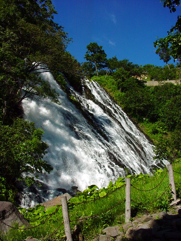 チャラッセナイ川にかかり、落ち口から二筋に分かれ、玄武岩柱状節理を豪快に滑り落ち目の前に広がるオホーツク海にそそぐ。
