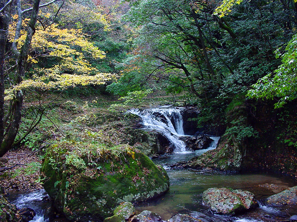 谷の中間地点くらいに庭園のような空間の紅葉滝が現れる。