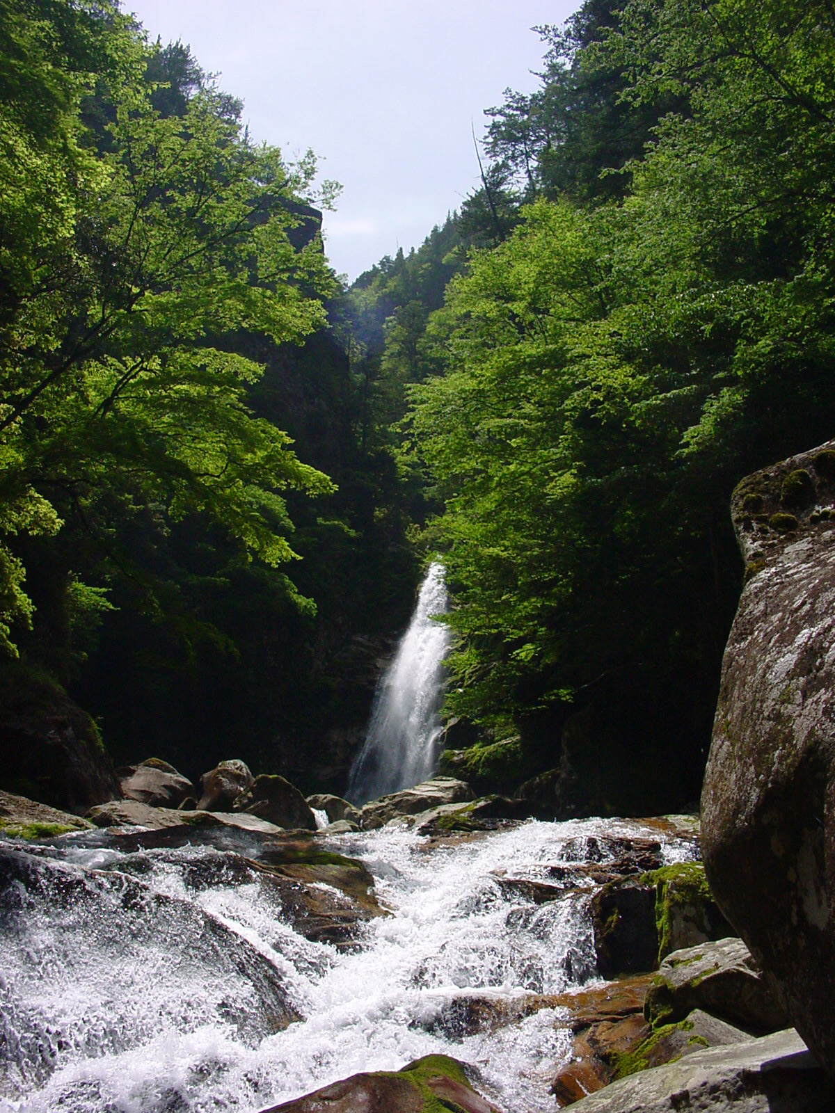 笹の滝 2007/05/27 奈良県吉野郡十津川村内原 落差32m 十津川周辺は東西には、あの酷道425を通ることになる道以外に天川村からの道もある。 天川村までは郡山ICから南下して近鉄大和八木>下市口(R169沿い)そこからR309を南下するとR169を南下するより早い30Km程の快適道路だ。 天川村からは168号線に西進(この道路はやや曲折が多い)したのち168号線を南下し「谷瀬の吊り橋」を見て更に7〜8Km南下した風屋ダムを過ぎた滝屋口から左折し滝川沿いの細い道を行くと笹の滝駐車場に着く。 |