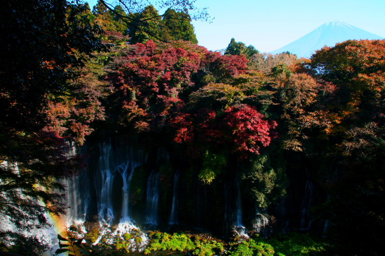 この写真は約1時間後の十時ころのぎりぎり虹つき富士山つきの白糸の滝だ。