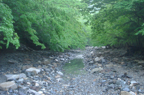 ・5:35 弥山川・白川八丁の水の無い川原に到着。この地下を伏流水が流れていて2〜300m下流で姿を現すのだ :・・・ 小休止。(35分経過) |