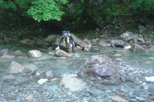 ・白川八丁:何度も何度も左岸、右岸の渡渉繰り返し。右のたけちゃんは、キャッチャーをやっていたので足腰が通常人の数倍強い。とても初心者とは思えない。 |