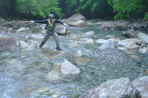 ・6:29 「あらよっと!」濡れた岩ではこんなことしてはだめですよ! 潔くジャブジャブが正しいのです :・・・(1時間29分経過) |