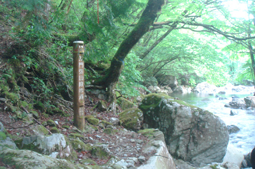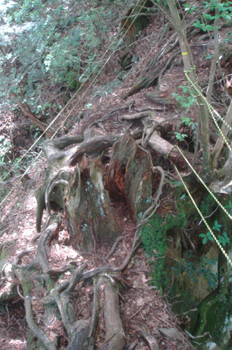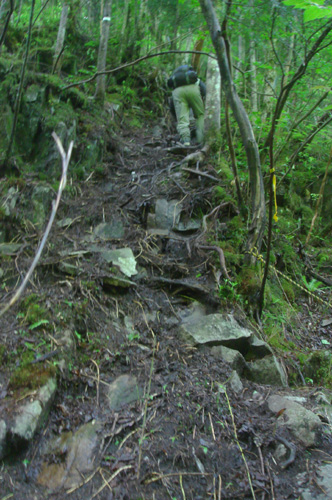 ・7:52 橋が崩壊し雨でぬかるんだ路無き路を赤テープを頼りに急斜面のトラバースや高巻き・木の根や濡れた岩のぼりを繰り返しながら1時間ほど格闘し河原に出る 今回のコース中最難関だったといっていい行軍でした。小休止2回。 :・・・(2時間52分経過) |
