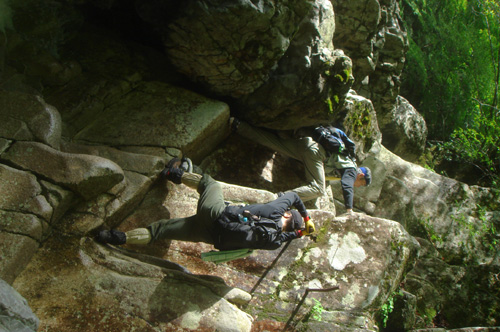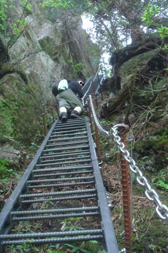 ・9:49 水平梯子。下は底無しの谷。 はじめさんいい靴はいてんな〜。 :・・・(4時間49分経過) |