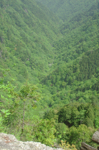 ・10:02 天空の鎖場登り眼下に歩いて来た谷がはるか下に見える。ここが堪らなく爽快な場所だった。 グライダーでスーっと飛べたら最高だ。 「おしっこー」って聞こえたけど誰? :・・・(5時間02分経過) この後・登り梯子はNo28で終了。 ・大きな岩の傍の鎖を伝って蟹歩きの回り込み路 ・そして4つの下り梯子で滝前テラスだ。+600m |