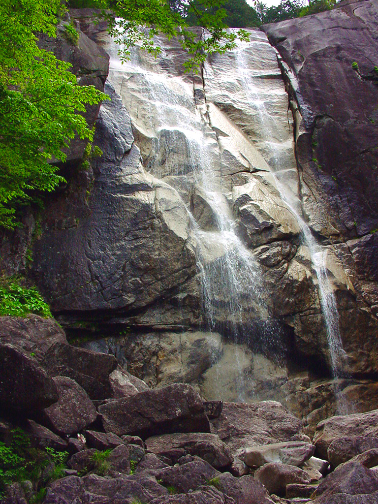 田立の滝群主瀑の 天河滝(てんがだき)2005/06/04 長野県木曽郡南木曽町田立 落差35m 幅13m 木道には、アイゼンの爪痕が無数にある遊歩道というより登山道だ。 標高1300mの花崗岩の白壁に流れ落ちる滝は美しく清清しい。 落差96mと標示されるがどうみてもそんなにはない。 華厳の滝で97m、箕面の滝が33mとなれば箕面の滝に近いように見える。 戦国の戦火で壊れた都の神社仏閣修繕に木が伐採され地元から裸山を見上げると、霧ケ滝、天河滝、不動滝が一本に立っているように見えタルダチ>タダチになったとか。 そのせいかどうかこのあたり一帯は尾張藩の留山(山林保護のため狩りや伐木を禁じた山のこと)だったこともあり地元の人々が滝を神聖視し、雨乞いの神事以外に山に入る事を禁じたという。 うるう滝、らせん滝、洗心(せんしん)滝、霧ヶ滝、天河(てんが)滝、不動滝、そうめん滝等大滝川の峡谷にかかる無数の瀑布を総称して「田立(ただち)の滝」と呼ぶと案内されている。 |