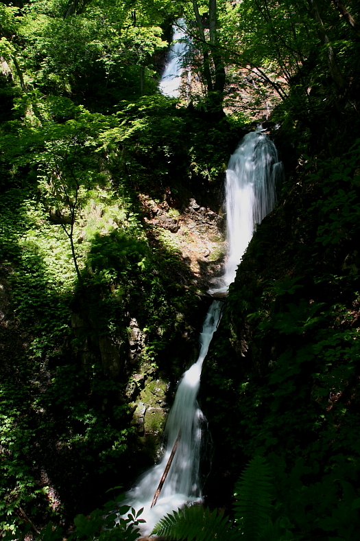 小根津戸の滝(雄滝) 2009/06/13 秋田県鹿角市十和田大湯 落差:雄滝:44m。 滝の向き=南西 R103号沿いに「食事処山賊」というレストランと花屋。 遊歩道入口は国道を挟んで反対側に標識があり2〜3台の駐車スペース有り。 遊歩道すぐに雄滝と雌滝の分岐があり、雄滝は10分程で着く大湯温泉を代表する滝。 滝の落ち口が見通し難い。 「止滝」からR103更に5km程南下して「食事処山賊」に到着した頃には雨が止んだ。 道路反対側の熊警告の看板を横目に「小根津戸の滝」遊歩道に単独で入ったのが11時半過ぎ。 「やんちゃして滝の上に登らないよう!」との金さんの警告の意味することがこの時はまだ知る由もなかった。 「雄滝」に10分たらずで到着し金さんの警告の意味が理解できた。 時間余裕あれば上段の下に登って滝壺を見てみたい誘惑をこらえる。 |