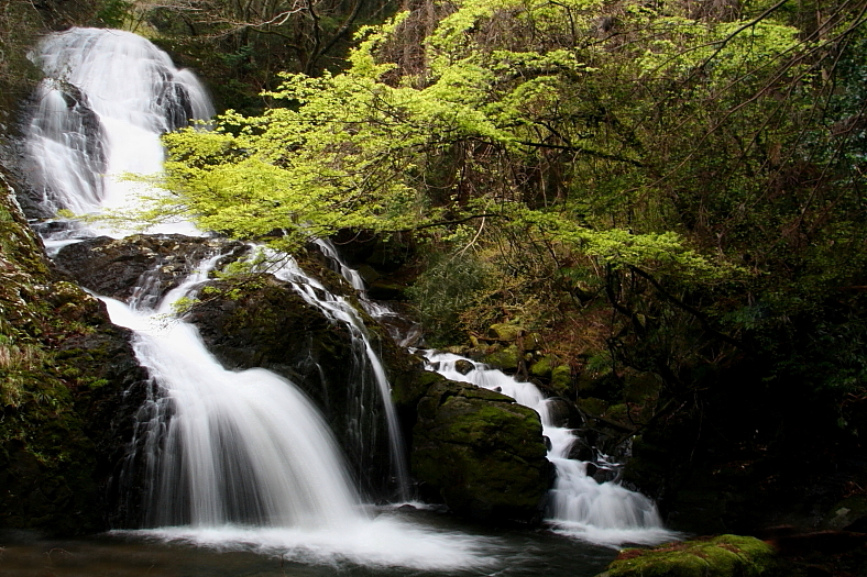 柔らかい光の注ぐ沢なので撮りやすいのだが滝壺や周辺の緑に枯れ枝が引っかかって景観を損ねているのが惜しい。