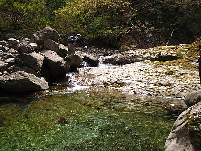 最初の渡渉地点で岩の上からジャンプする我輩の画像(左)がおいわさんのコンデジで撮られていた。