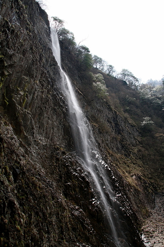 高瀑 2009/05/01 愛媛県西条市小松町石鎚 落差:132m 高瀑下の「無名滝」を横目に「天狗の子育て岩」の前を横切り最後の急登を越えた先に高瀑の大岸壁のパノラマ風景が眼に飛び込んでくる。 到着11時48分。 車を置いた場所から2時間37分の奮闘だった。 時間的にはほぼ「御来光の滝」と同等だが肉体的難度は帰路で差がでることが昨年の経験から解っている。 「御来光の滝」の面河渓からの”地獄の登り返し”は我輩の少ない滝行き経験では未だ経験したことのない難所であることには間違いない。 それはさておき我輩の「高瀑」で最初のシャッターは高い右岸からの逆光撮りと決めていた。 (おいわさん)の光る飛沫写真を見た影響は大きい。 昨年は右岸に登る前にガスが降りてきて早々に引き揚げてきたのだ。 当日の空は曇り気味であったが時々太陽も顔を出してくれた。 |