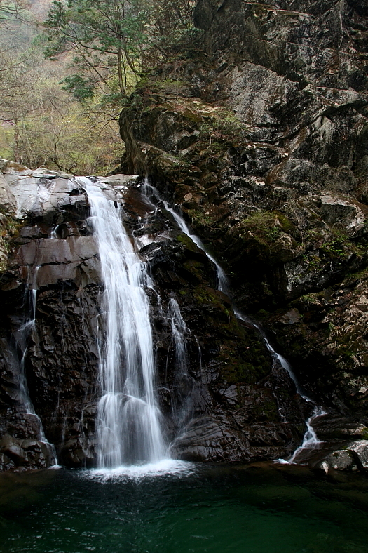 のぞきの滝 2009/05/01 愛媛県西条市小松町石鎚 落差:6m 林道終点3時40分ころ到着。 小休止の後いろんな花やユキモチソウなど撮りながらのんびり下る。 車に4時50分過ぎ>諏訪神社駐車場5時23分帰還。 なかちゃんは直帰、えーちゃんは明日の「御来光の滝」に備え石鎚スカイラインの土小屋へ移動のアドバイスをおいわさんがした。
