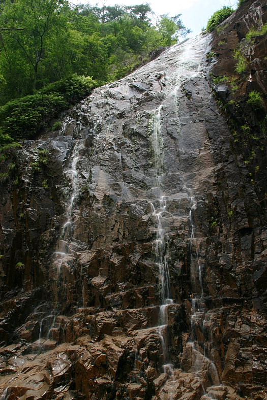 多羅多羅の滝 2008/07/13 広島県 広島市佐伯区湯来町大字和田 水内川左岸の支流 落差:上段:10m、中段:25m、下段:19m 「大山地の滝」を発ちR488>R433と進み11時15分「多羅多羅の滝」近くの雑貨店で遊歩道入り口を尋ねると丁寧に教えてくれ駐車してもいいという。 店の裏手に廻ると「遊歩道標示」に0.3kmの標示。 実距離はもう少し有ったように思うが細身の「下段の滝」に到着し早速撮影していると(写録の旅人さん)が「この上が主瀑だよ」という。 左岸に階段がありさらに上に登る太い鎖が下がっている。 |