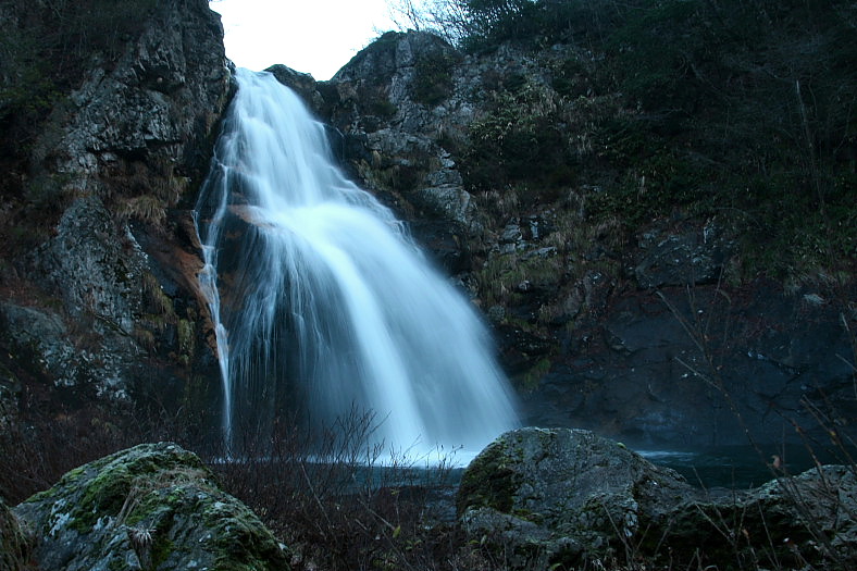 正面を避けた下流側の岩に足を運び岩に腰掛て手撮りで撮った。