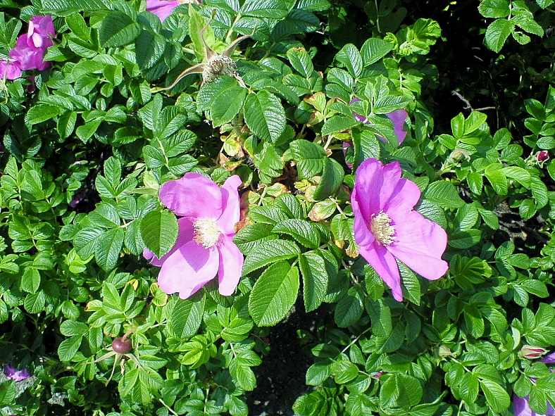 さんが興味のある旧・花田家番屋などを見学している間に浜辺側のモニュメントの傍に行ってみると綺麗なはまなすの花が満開だった。