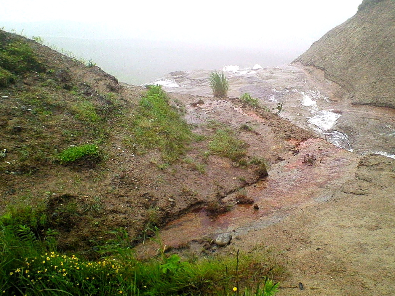 左岸の盛り上がった赤土に登って恐る恐る下を覗くと細々とした踏み跡が笹の急勾配に消えていた。