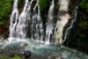 川沿いにくだって小さな橋を渡って右折しもう一度青い橋を渡りながら右側の崖をみると青白い流れが見えます。