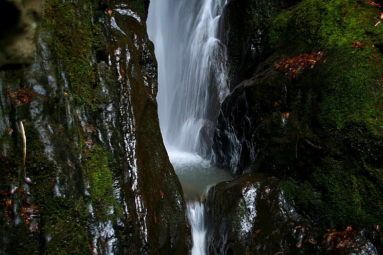 少し下ると左手の雑木越しに滝の最上部が見えてくる。