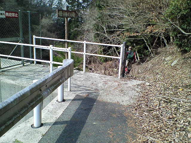 500mほどコンクリートで囲われた溜池を回り込むようにコンクリート道を降りてゆくと「母栖の滝→」木標示から先は土道の下りとなる。