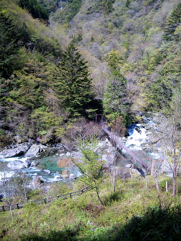 「アメガエリの滝」の上流の瀬戸川支流に落ちる「剣ヤ滝」は林道から見えているこの(吊橋)を渡るとすぐ。