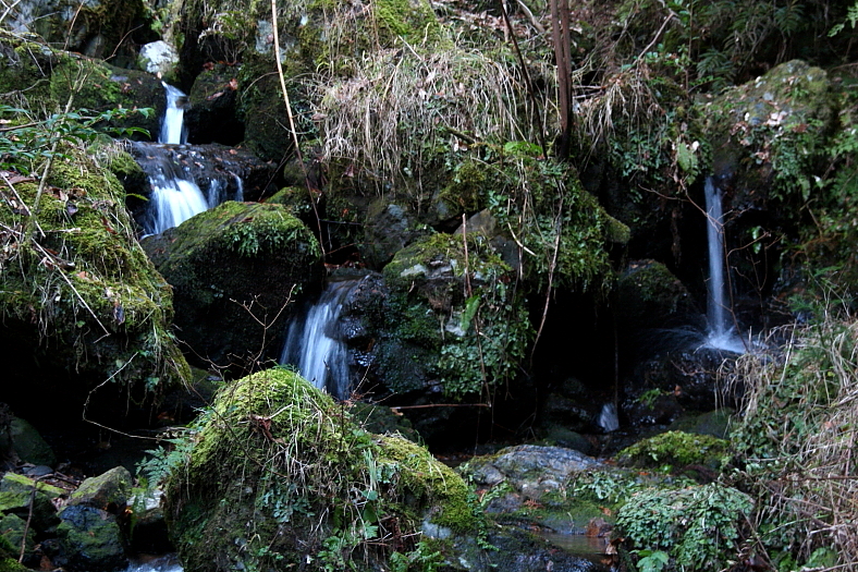 毘沙門の滝 2010/01/18 京都市右京区梅ケ畑川東 清滝川左岸毘沙門谷 落差:下流から橋下3m滝、6m2段滝、しばらくはゴーロが続き、5m滝、二段15m滝、6m滝、毘沙門の滝:20m 左岸作業道に戻り谷に直角の作業道は間もなく行き止まり。 左上に赤テープが見える急斜面を這い上がってみたが谷から遠ざかる気配。 眼をこらして見ると谷側の岩の傍に僅か踏み跡らしい状態が見えた。 20m程伐採雑木の上や下を潜ってトラバースし谷側に近づき岩の傍に出たが踏み跡は幻のように消えてしまった。 眼をこらして水音のする谷側みつめ何とか降りられそうなルートが構想できた。 ずるずるの傾斜を左右に選びながら下り「6m2段滝」の上流らしき谷に降りられた。 「6m2段滝」から35分もさ迷った12時20分写真の「小滝の渓流」の岩の上でアンパンの昼食休憩。 上空が青空の深い谷底で枯れ木が引っかかっている水の綺麗な心安らぐ谷だ。 熊鈴を片手で響かせながらの休憩。 |