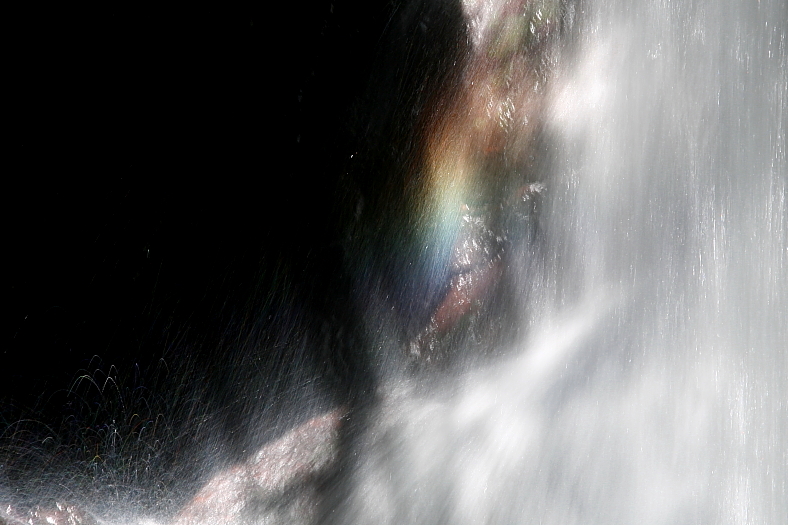 正午を過ぎると右岸の巨岩が滝壺側に影を造りだしてくるので滝壺の派手な飛沫に陽が射さなくなる気配だ。